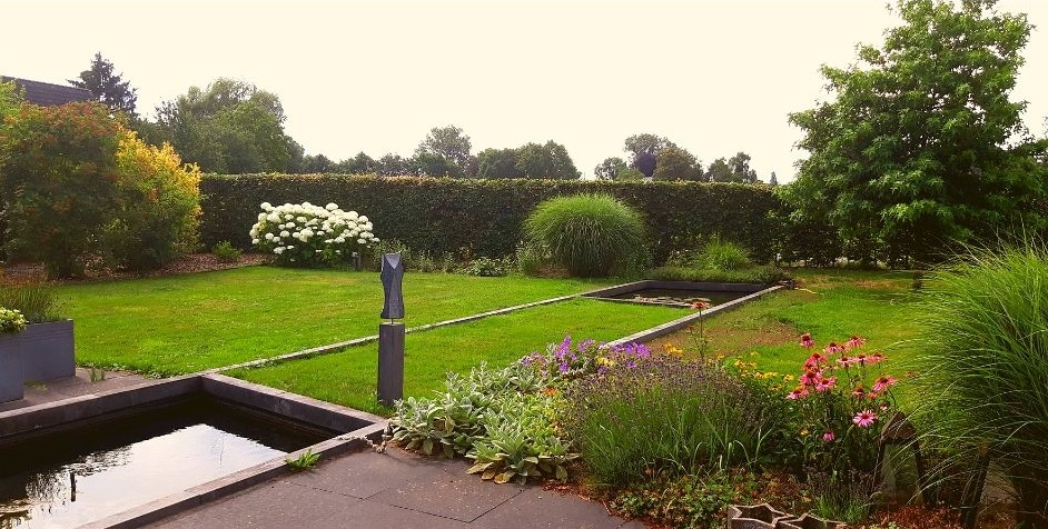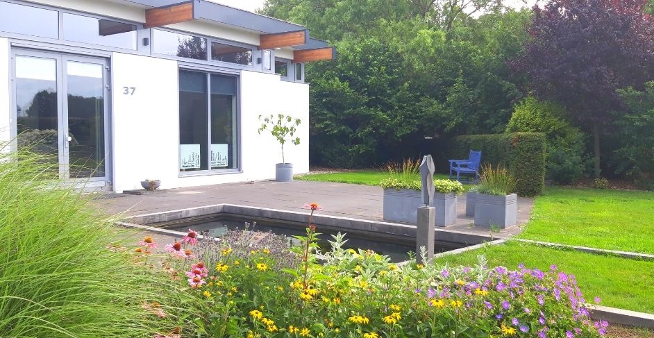 De uitdaging was de vormgeving van dit moderne huis met grasdak in harmonie te brengen met de tuin. Het strakke lijnenspel van het huis is terug te vinden in het horizontale vlak van de tuin.